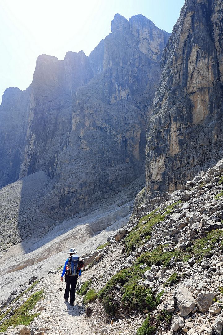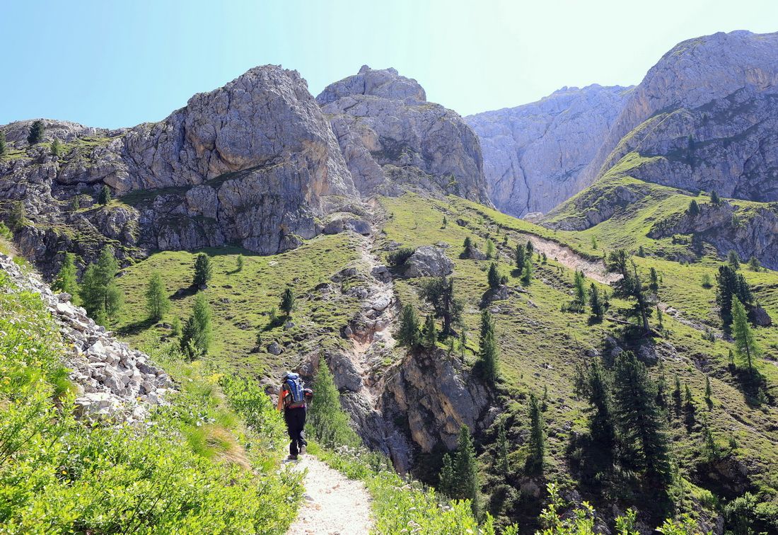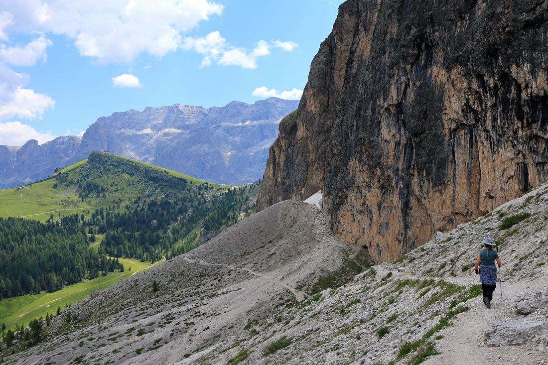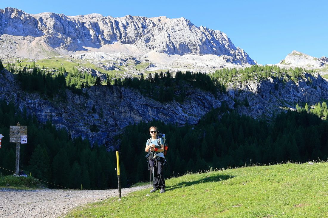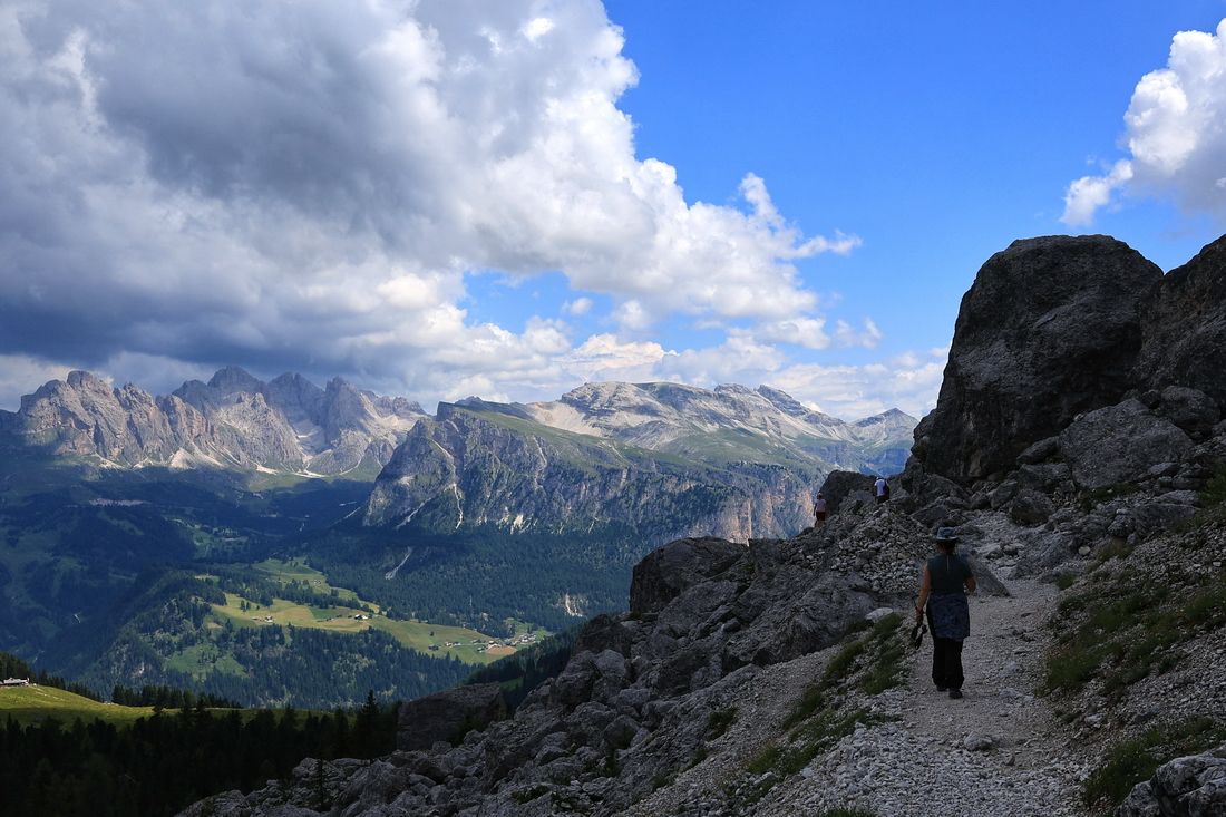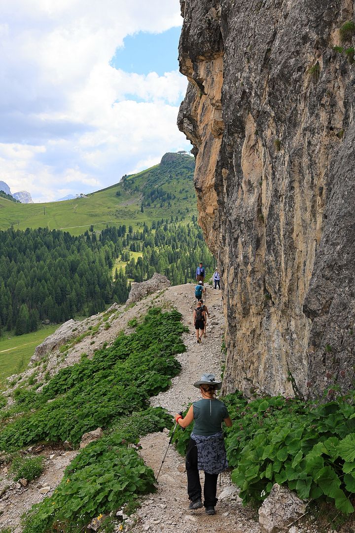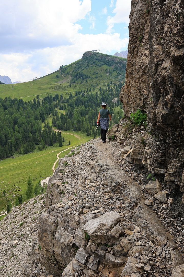 Tras remontar un repecho estamos en una especie de arista por la que transita el Vièl dal Pan (Camino del Pan), un antiguo sendero entre valles, al principio muy concurrido con varios chiringuitos, todo es zona de esquí. Después ya un poco más solitario, como pasa habitualmente en los Dolomitas donde las zonas accesible están bastante masificadas pero según te alejas vuelve la paz.