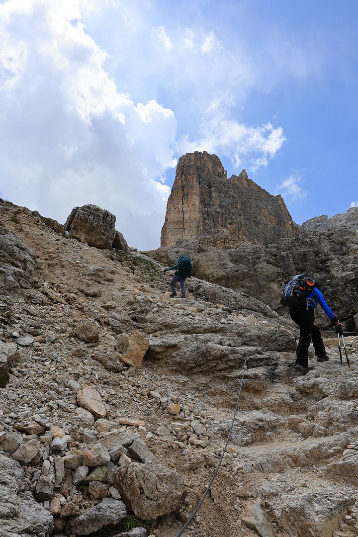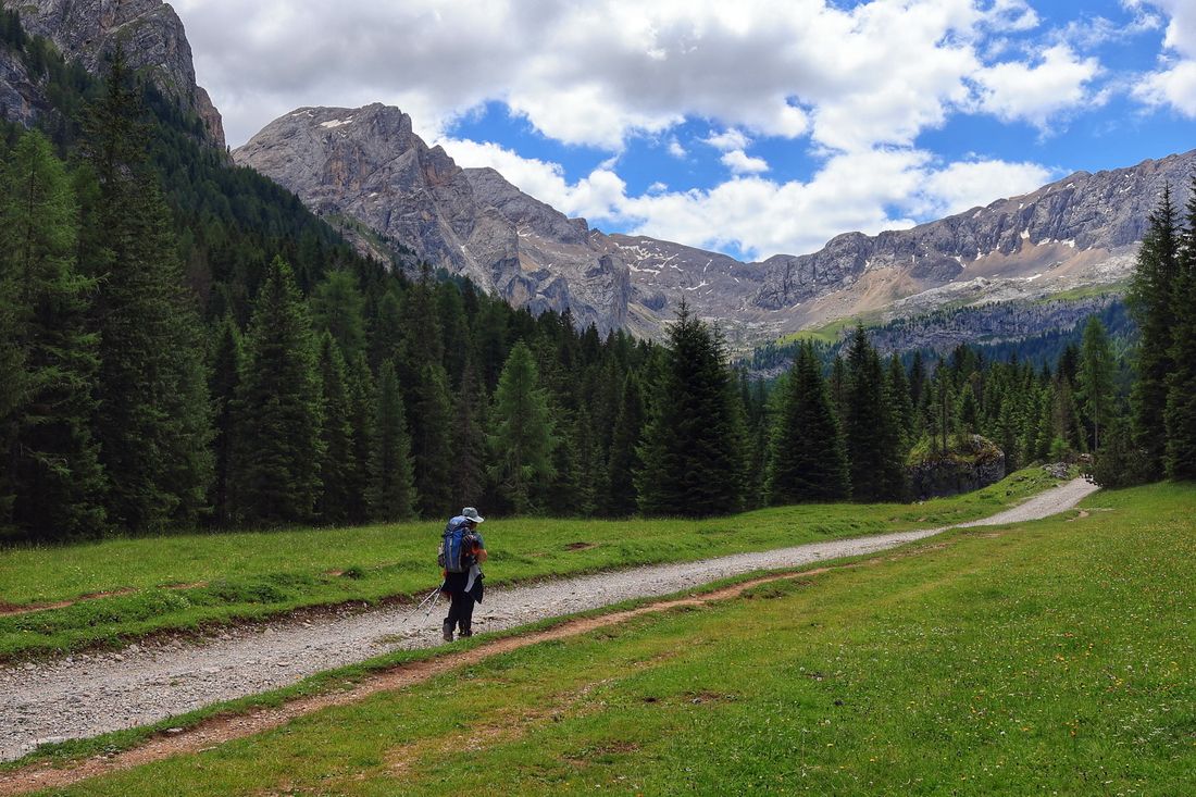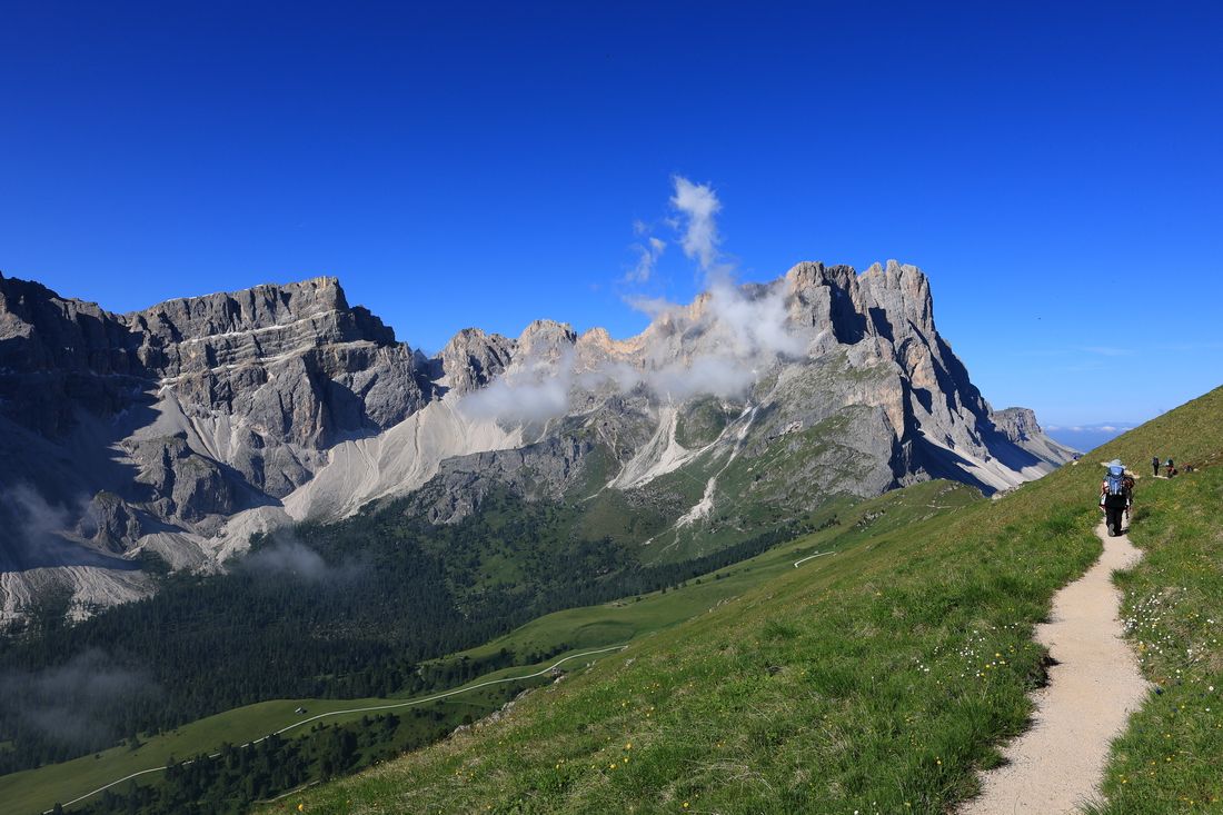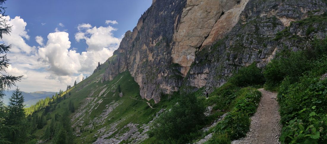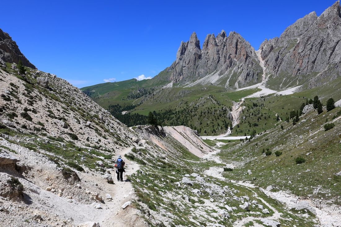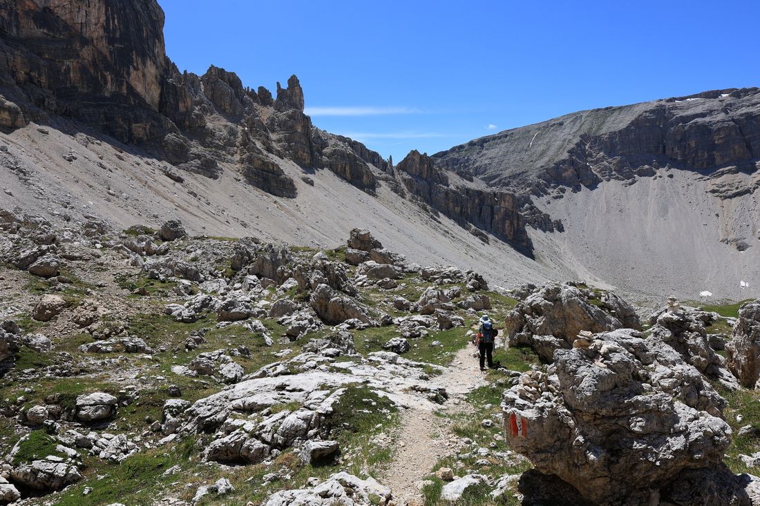 Tras remontar un repecho estamos en una especie de arista por la que transita el Vièl dal Pan (Camino del Pan), un antiguo sendero entre valles, al principio muy concurrido con varios chiringuitos, todo es zona de esquí. Después ya un poco más solitario, como pasa habitualmente en los Dolomitas donde las zonas accesible están bastante masificadas pero según te alejas vuelve la paz.