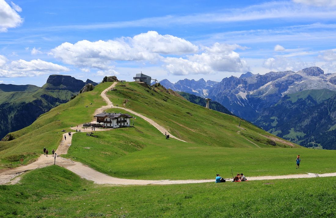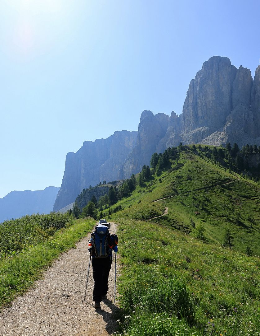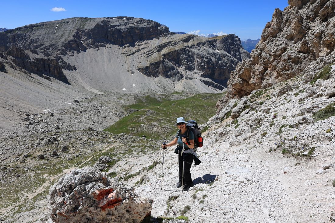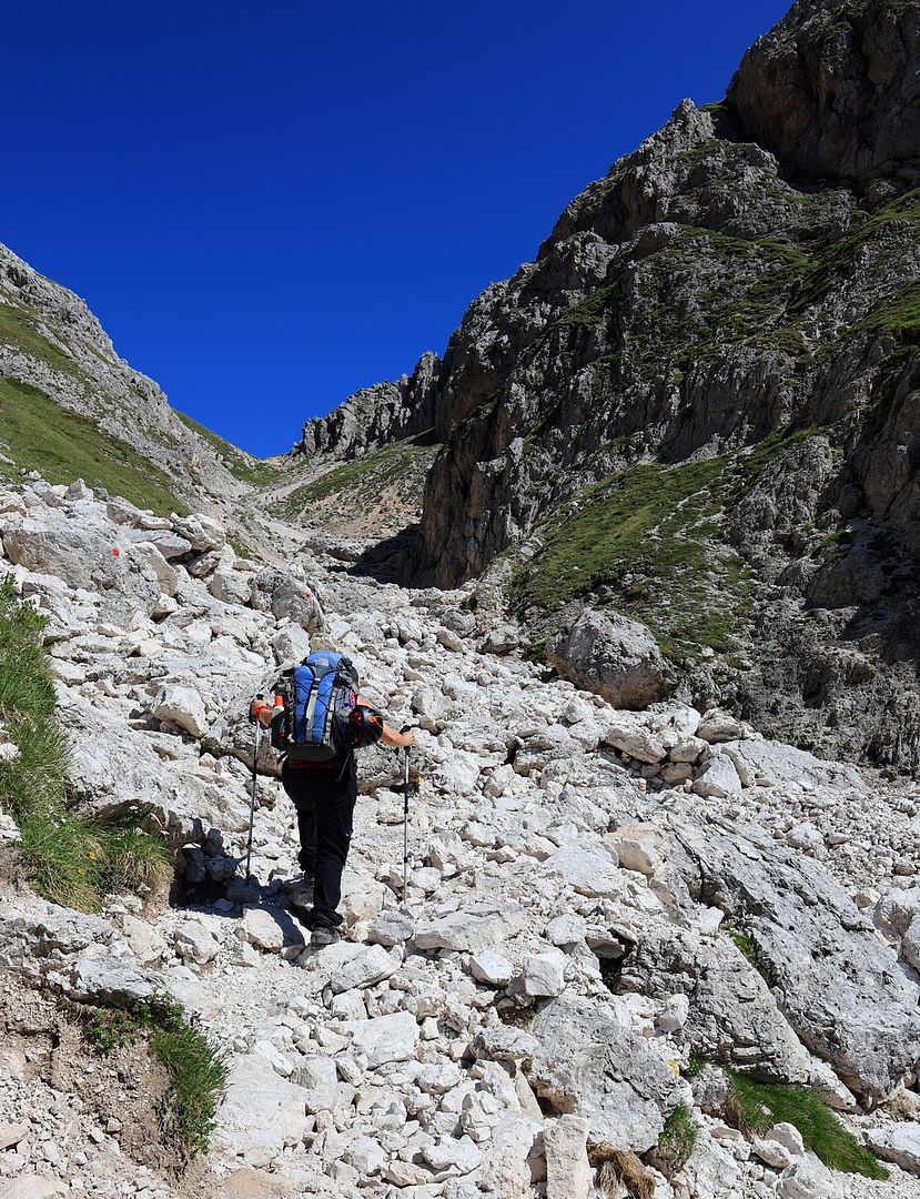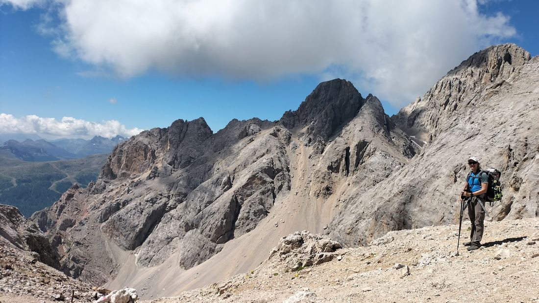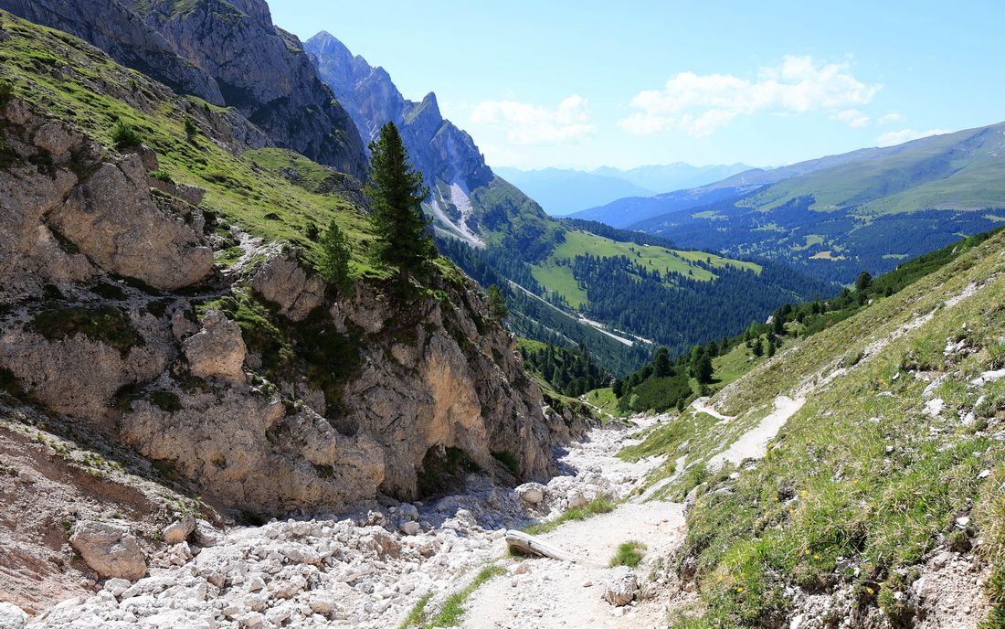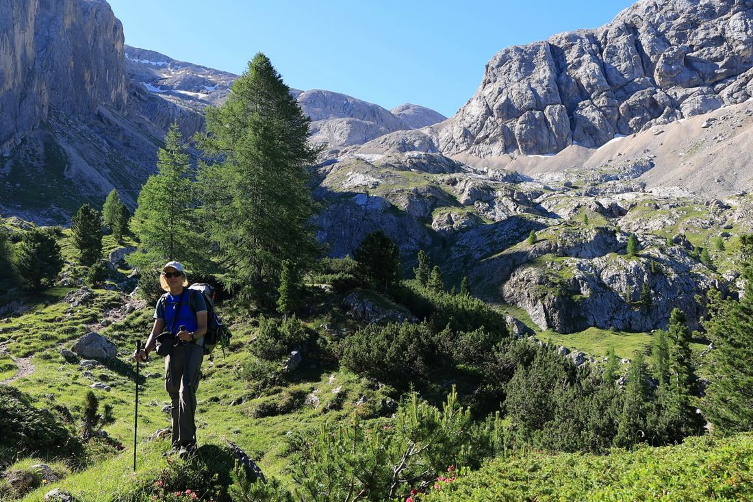 Tras remontar un repecho estamos en una especie de arista por la que transita el Vièl dal Pan (Camino del Pan), un antiguo sendero entre valles, al principio muy concurrido con varios chiringuitos, todo es zona de esquí. Después ya un poco más solitario, como pasa habitualmente en los Dolomitas donde las zonas accesible están bastante masificadas pero según te alejas vuelve la paz.
