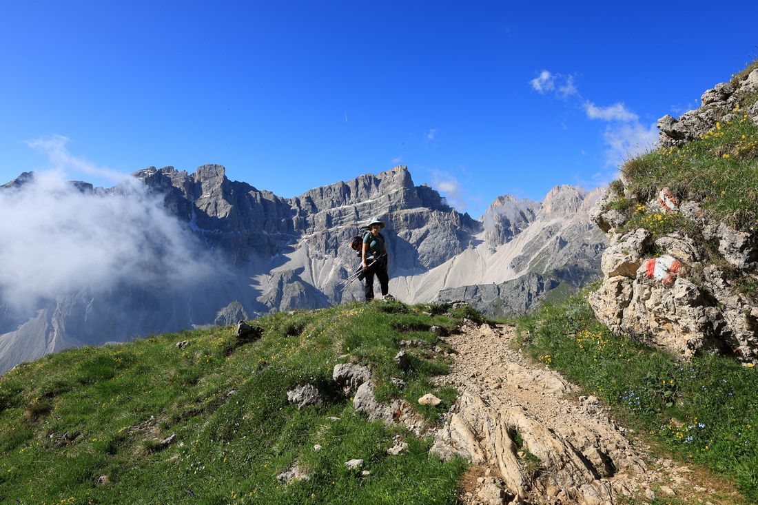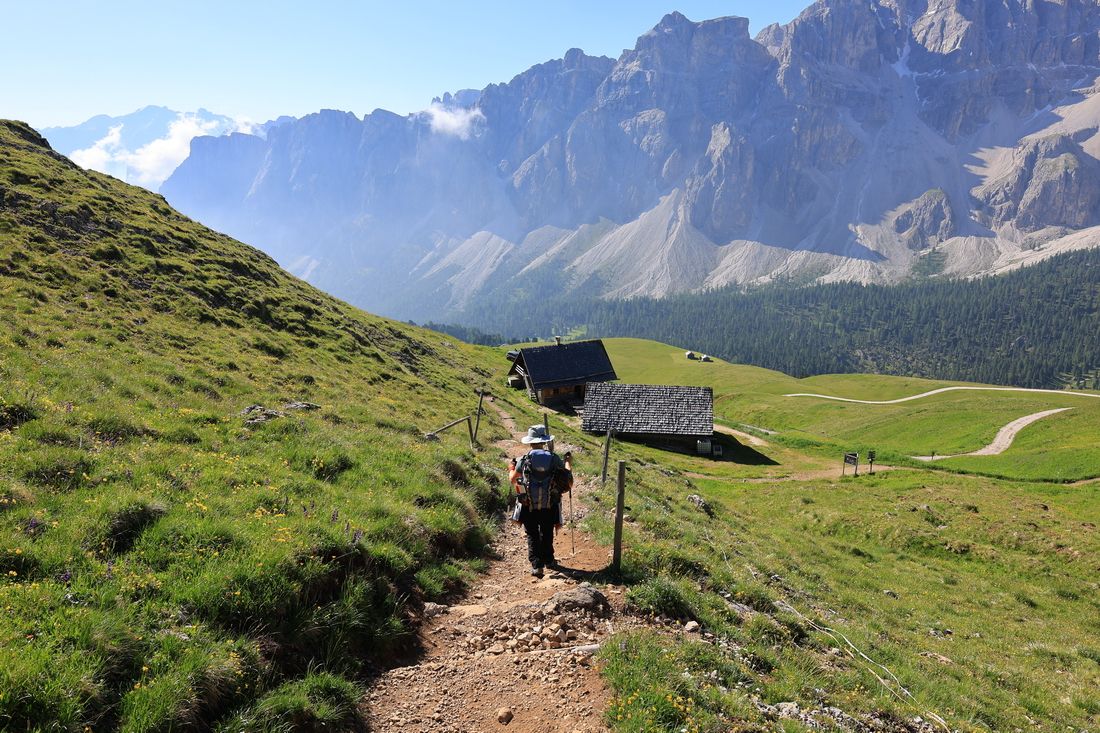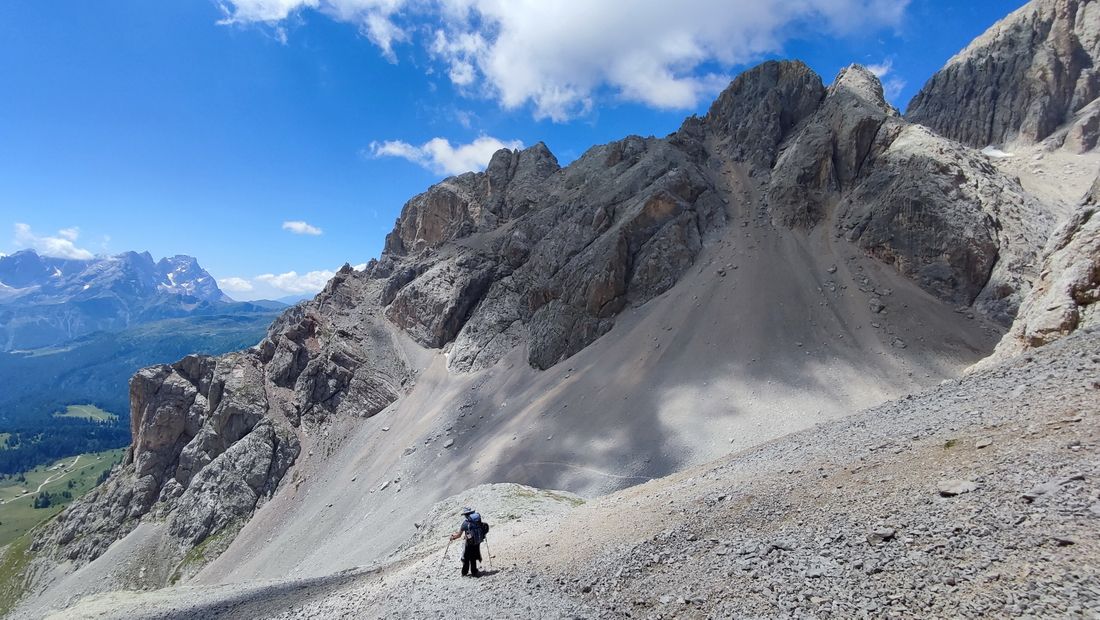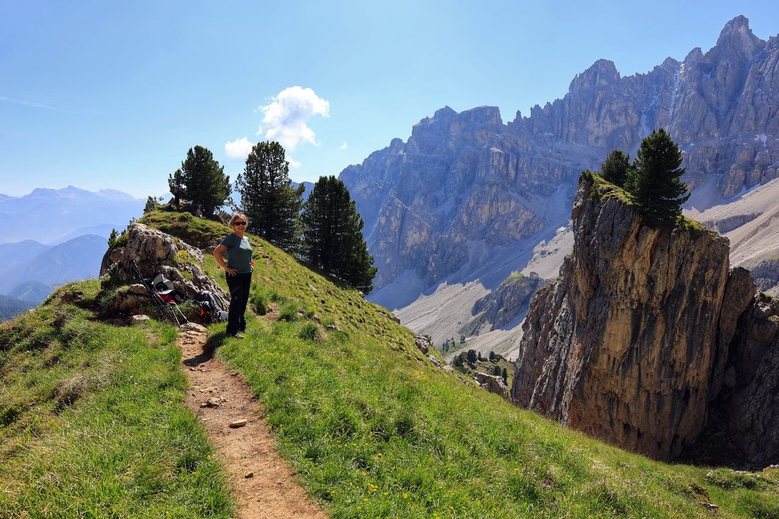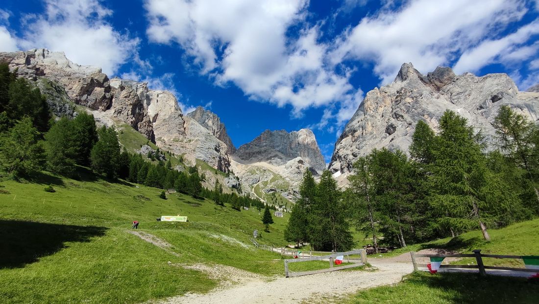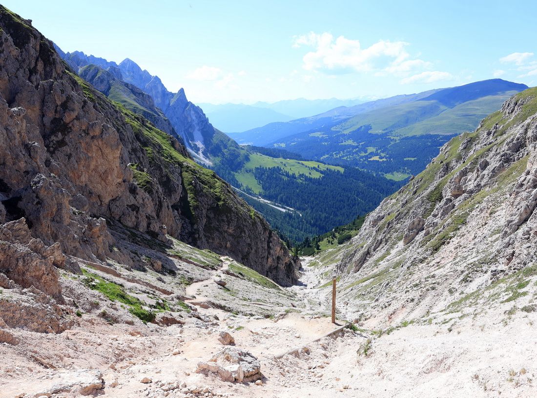 Tras remontar un repecho estamos en una especie de arista por la que transita el Vièl dal Pan (Camino del Pan), un antiguo sendero entre valles, al principio muy concurrido con varios chiringuitos, todo es zona de esquí. Después ya un poco más solitario, como pasa habitualmente en los Dolomitas donde las zonas accesible están bastante masificadas pero según te alejas vuelve la paz.