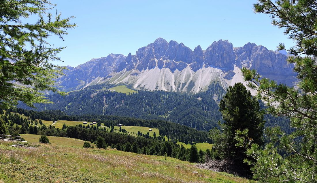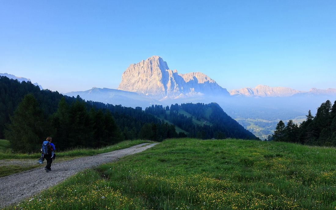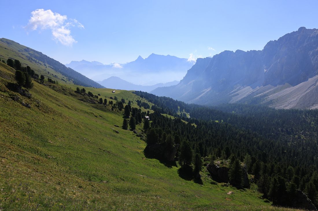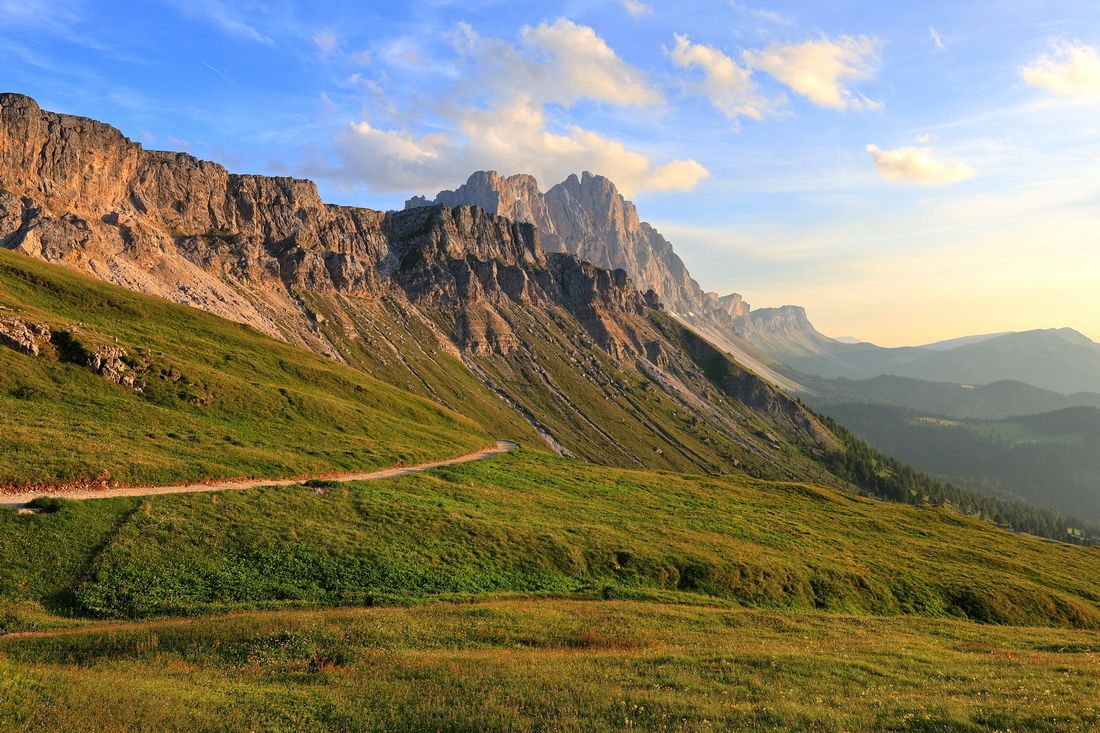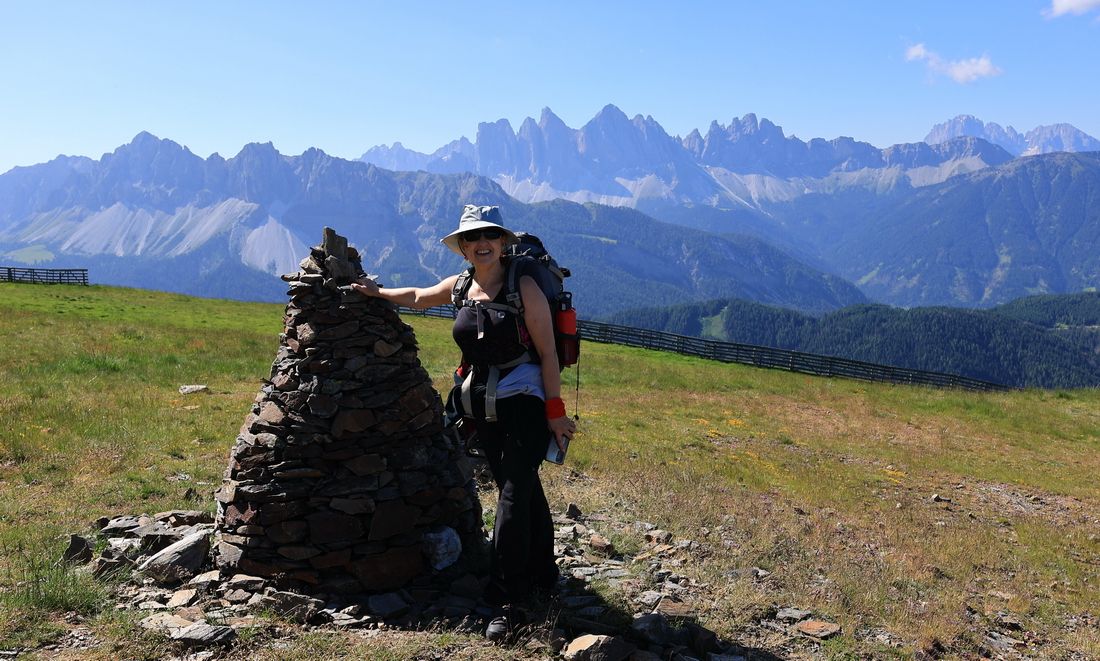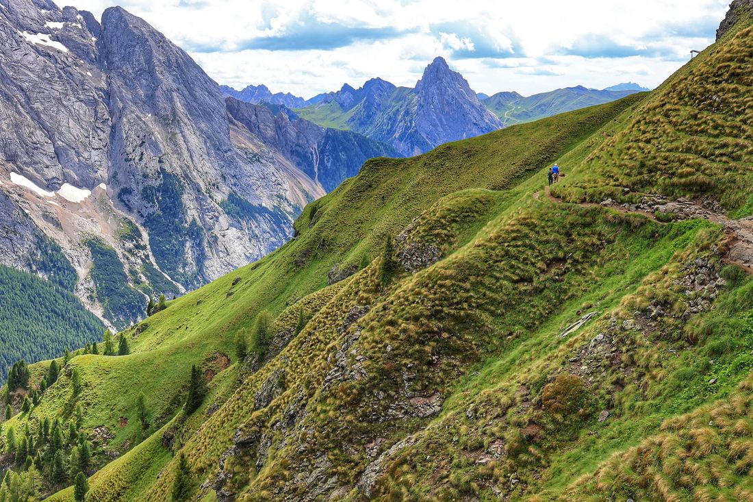 Meseta tipo polje y vista atrás del macizo del grupo Puez-Odle, declarado Patrimonio de la Humanidad por la UNESCO