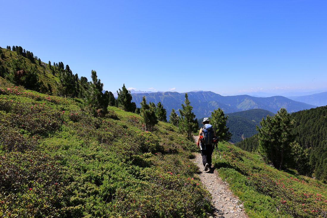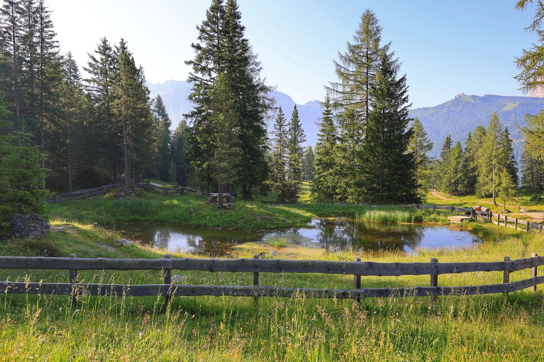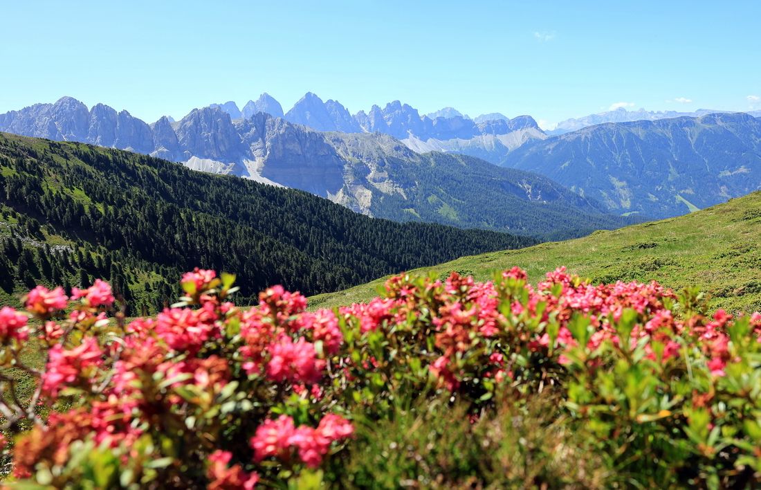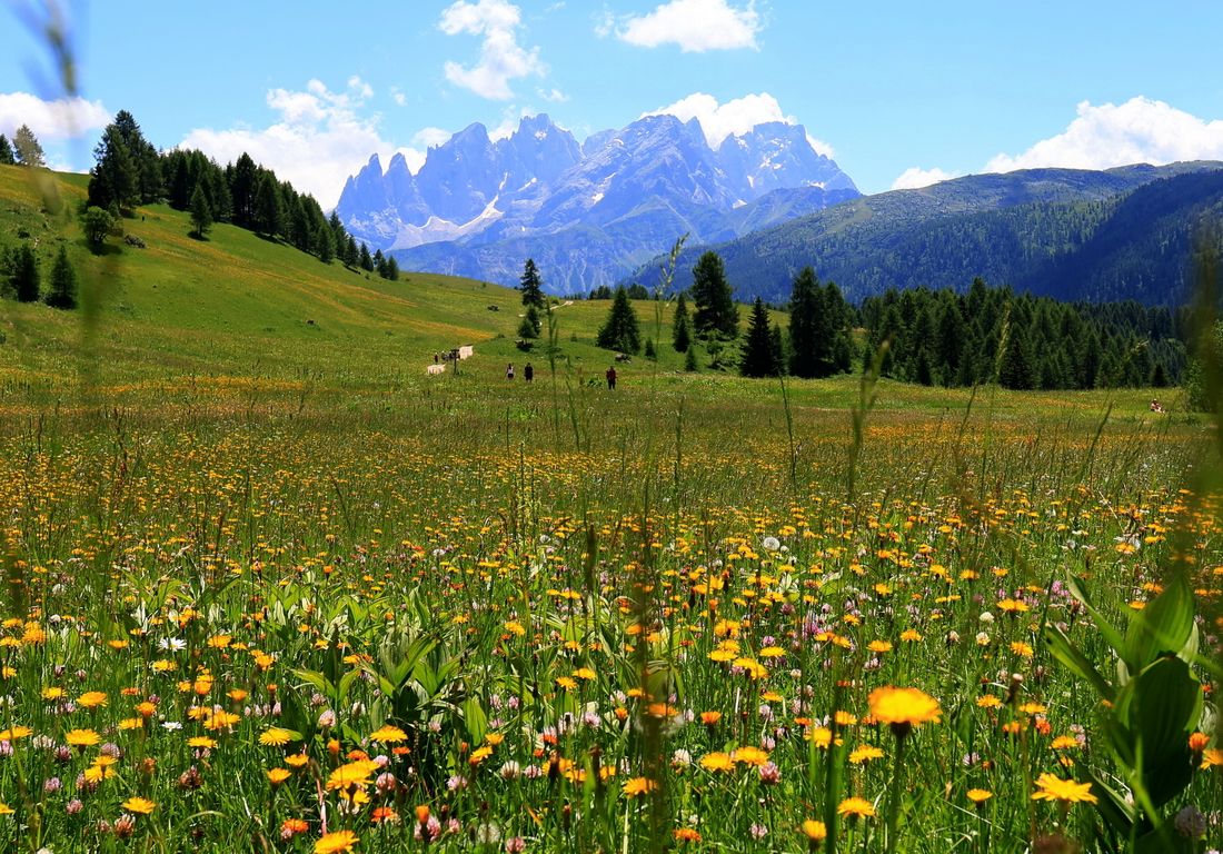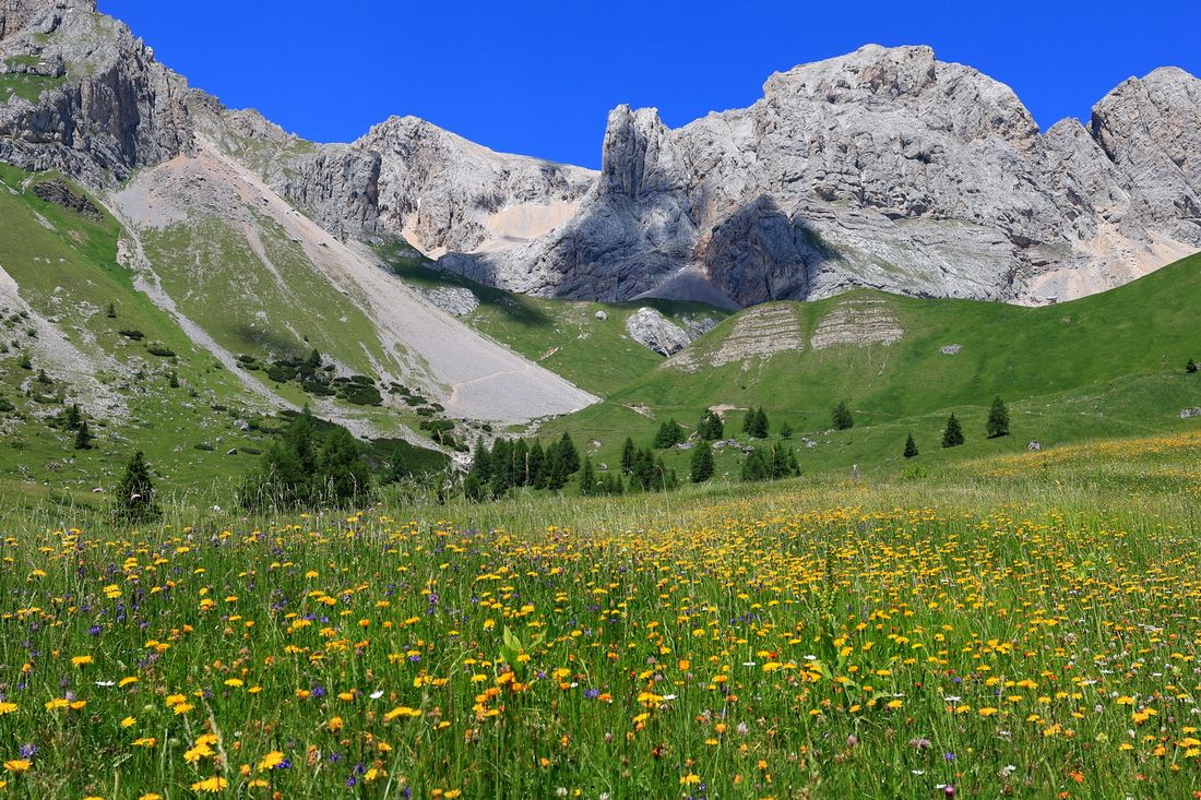 Meseta tipo polje y vista atrás del macizo del grupo Puez-Odle, declarado Patrimonio de la Humanidad por la UNESCO
