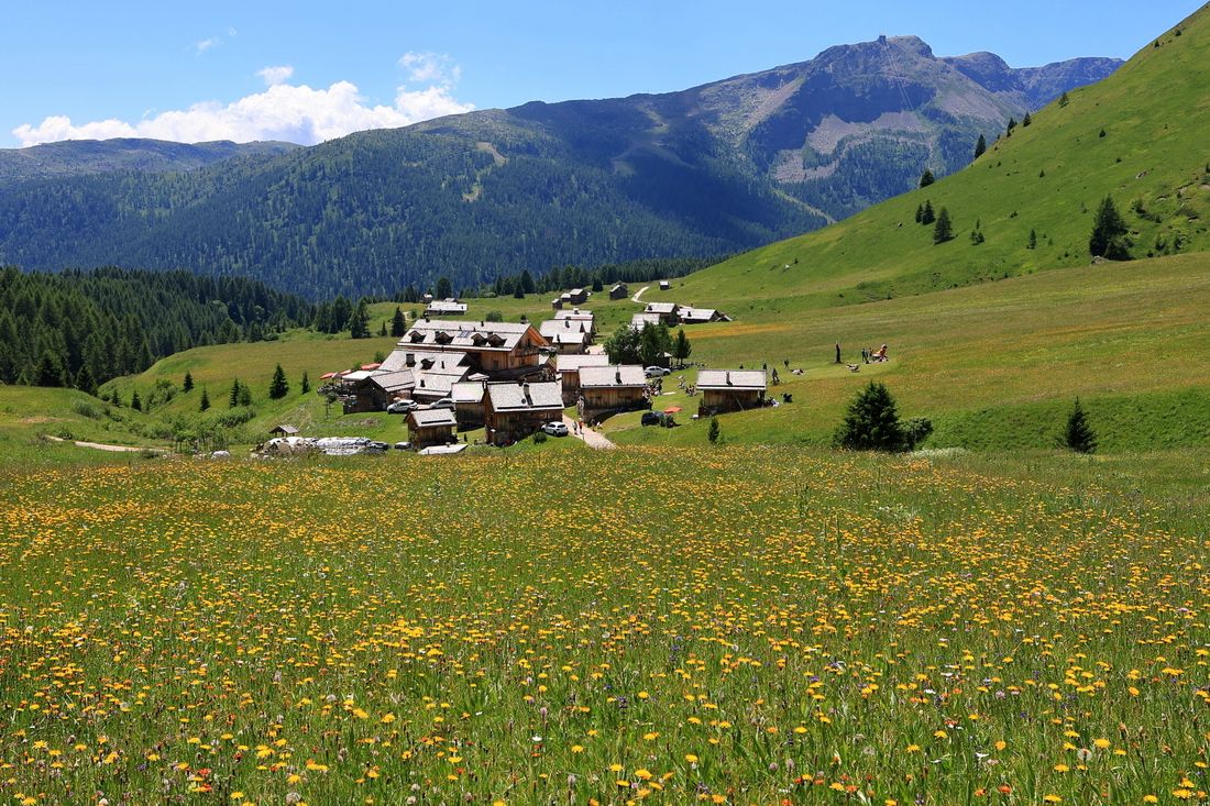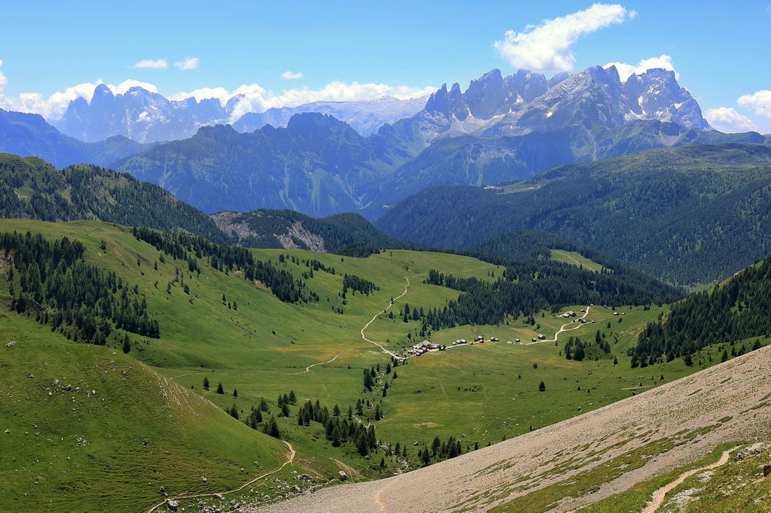 vistas al Alpe di Siusi (Seiser Alm), la meseta alpina más grande de Europa, con sus prados ondulados y granjas de montaña.