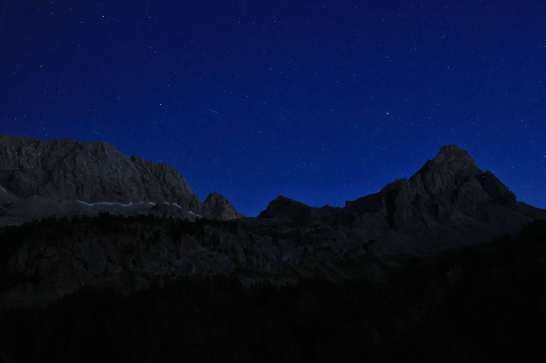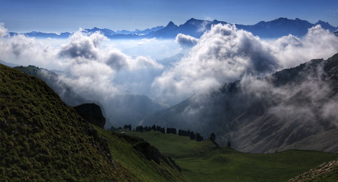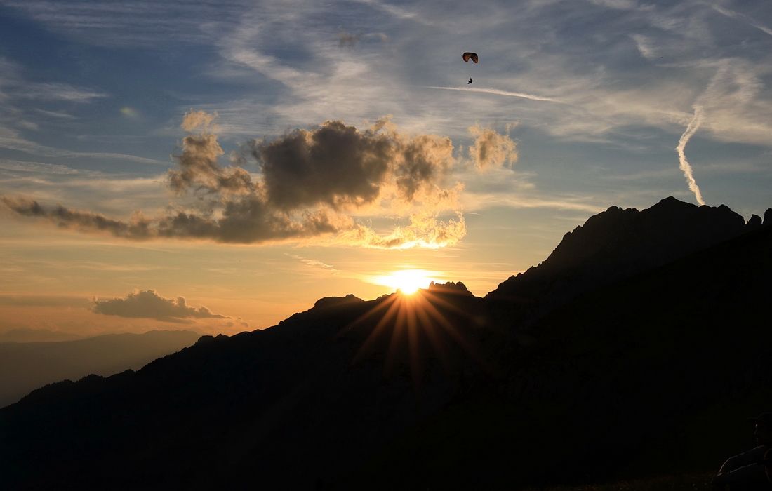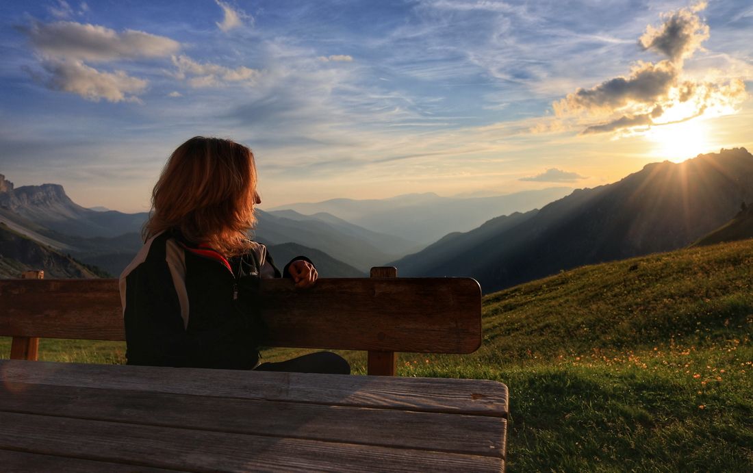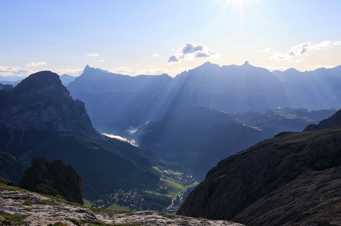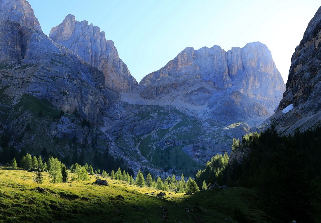 El sol va apareciendo entre las cimas de la Marmolada cual foco sobre las praderas alpinas.