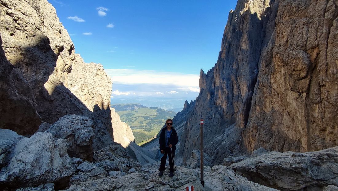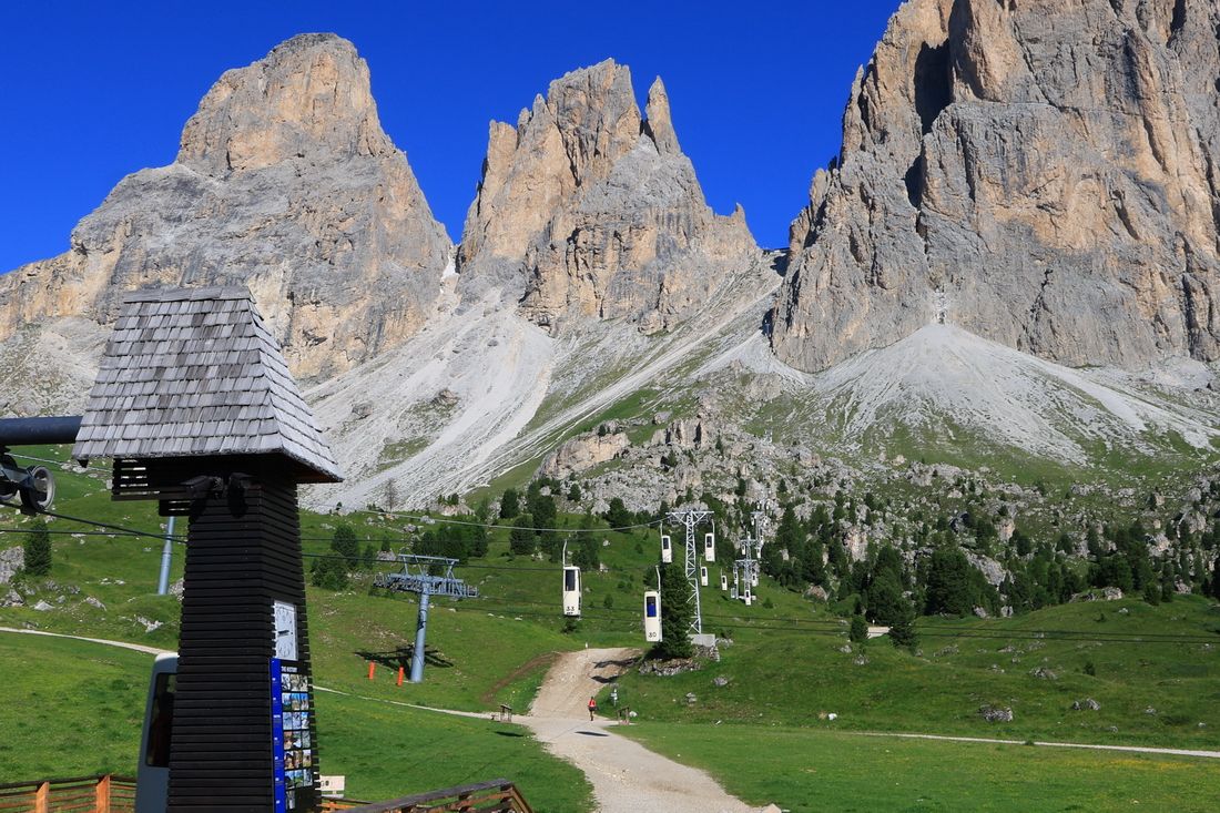 El punto de inicio es el teleférico que parte desde el Passo Sella (2.180 m). El remonte es peculiar: las cabinas son muy pequeñas, para ir de pie, y no se detienen, hay que subirse en movimiento, te dan unas muy breves instrucciones como p.e. "sujeta con la mano derecha una barra y salta a dentro", un operario tamaño ropero de encarga de empujarte dentro junto con tu acompañante que se ha subido 5 m antes. Esto ya pone un primer toque de aventura. En pocos minutos asciende hasta el Col Rodella / Forcella del Sassolungo (2.685 m), un collado estrecho y pedregoso, rodeado de torres de roca. Aquí empieza la ruta circular.