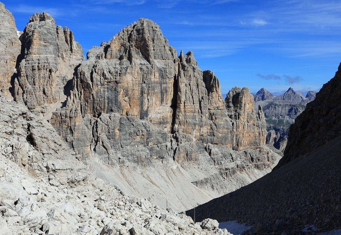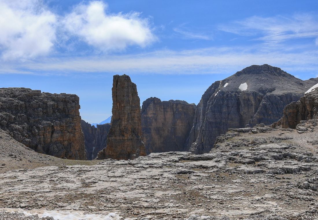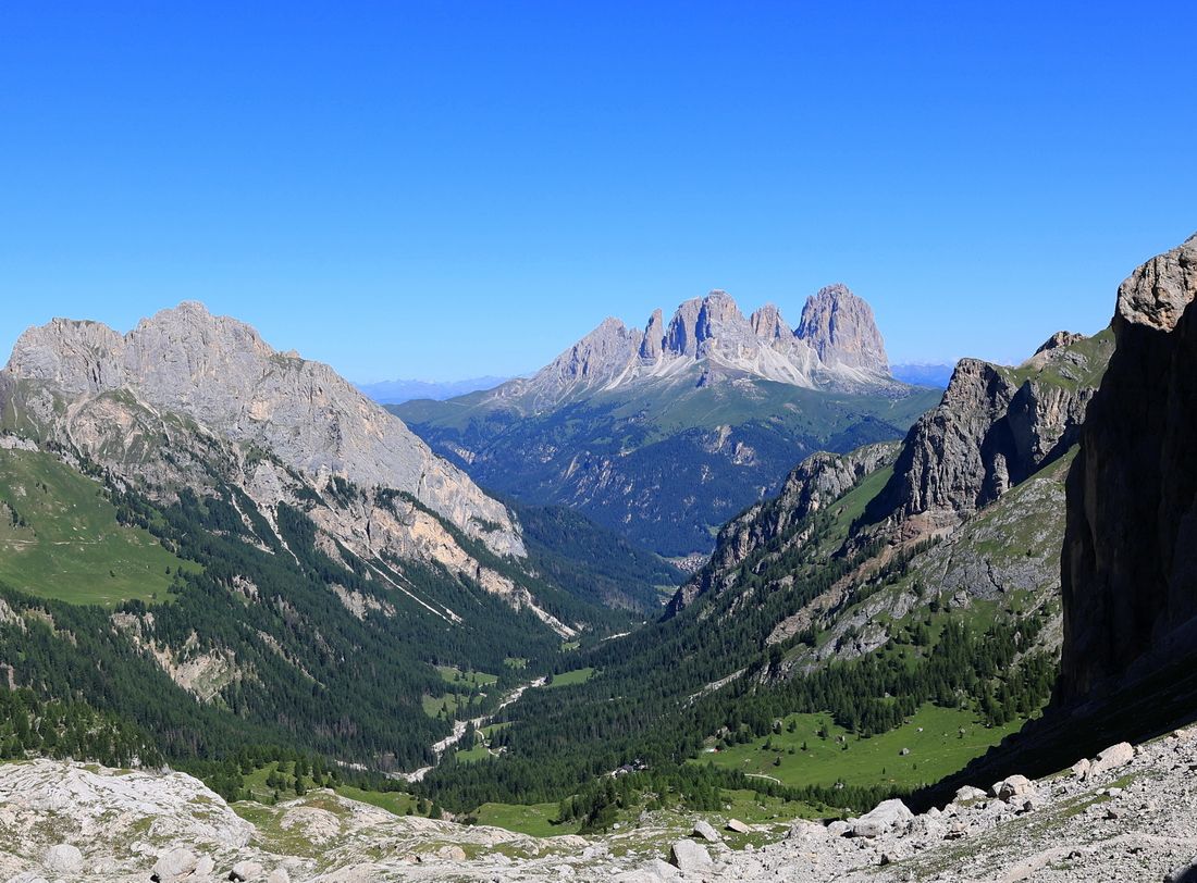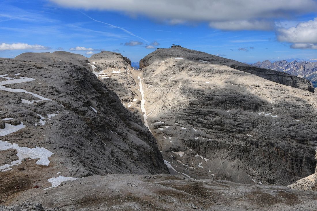 El grupo de Sella desde el sur, ahora vemos el Saas Pordoi a la izquierda y el Piz Boè a la derecha.
