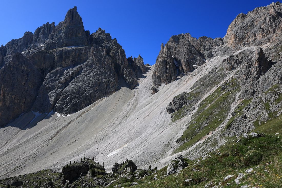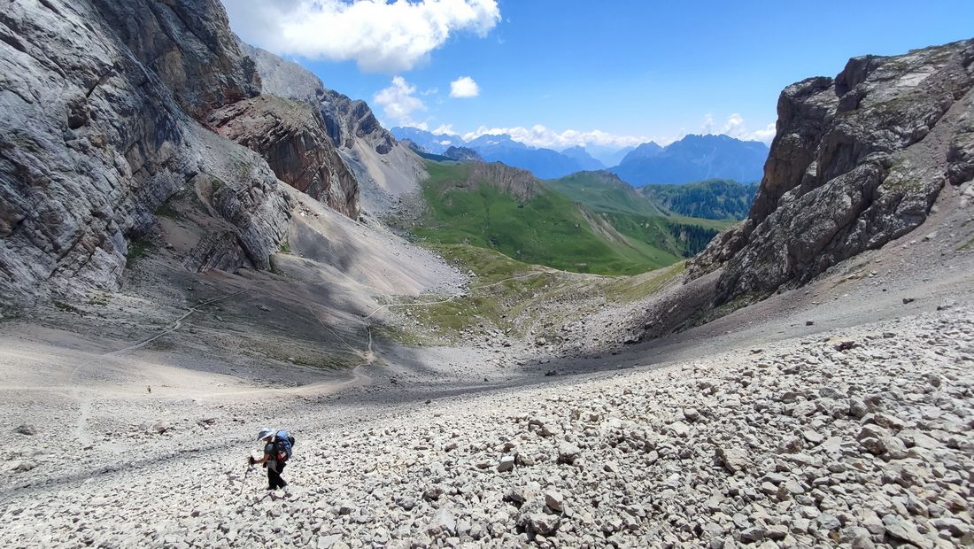 Tras una suave bajada comenzamos el ascenso fuerte de la jornada para alcanzar la Forcella della Rova-Roascharte, unos 400m de desnivel. Se ve al fondo a la izquierda.