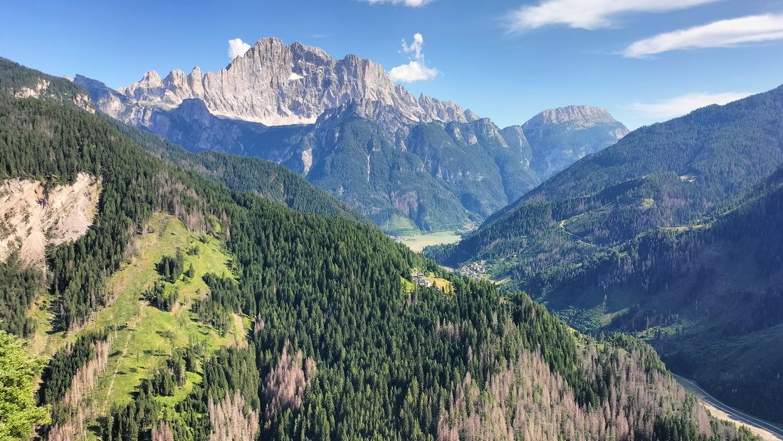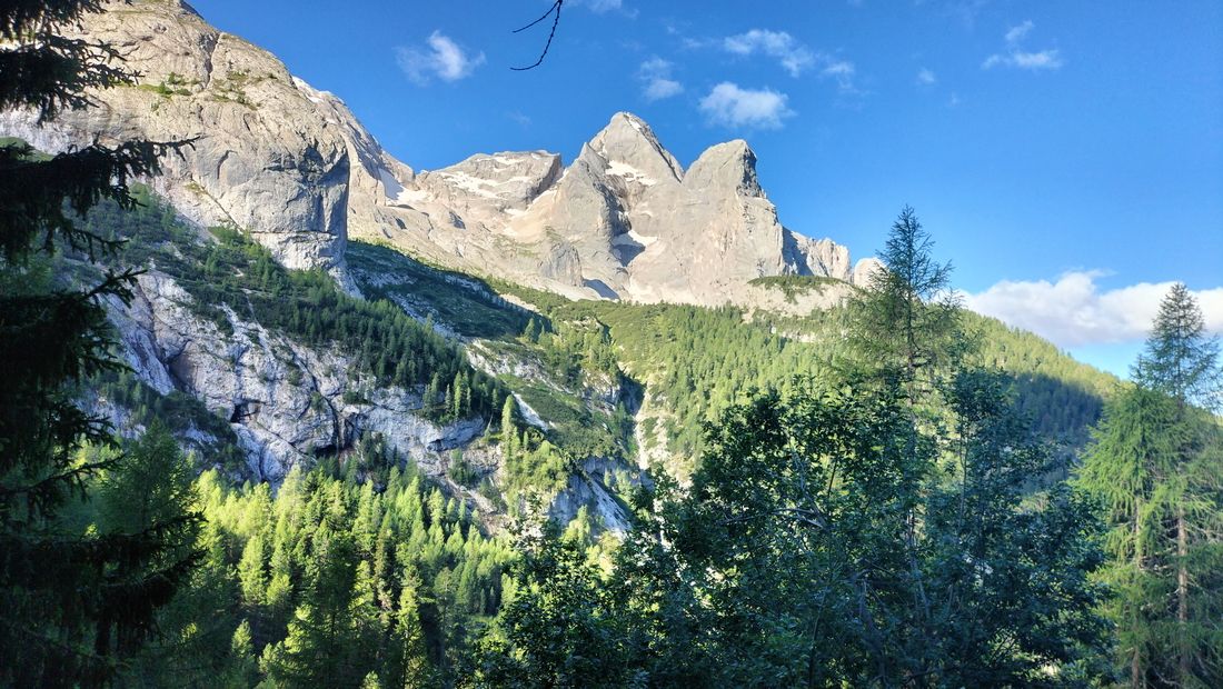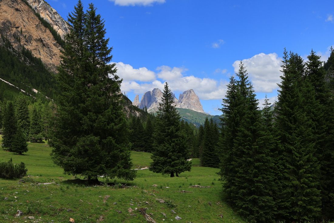 El majestuoso Gran Vernel (3.210 m.) según bajamos por el Val di Fassa entre un tupido bosque de abetos.