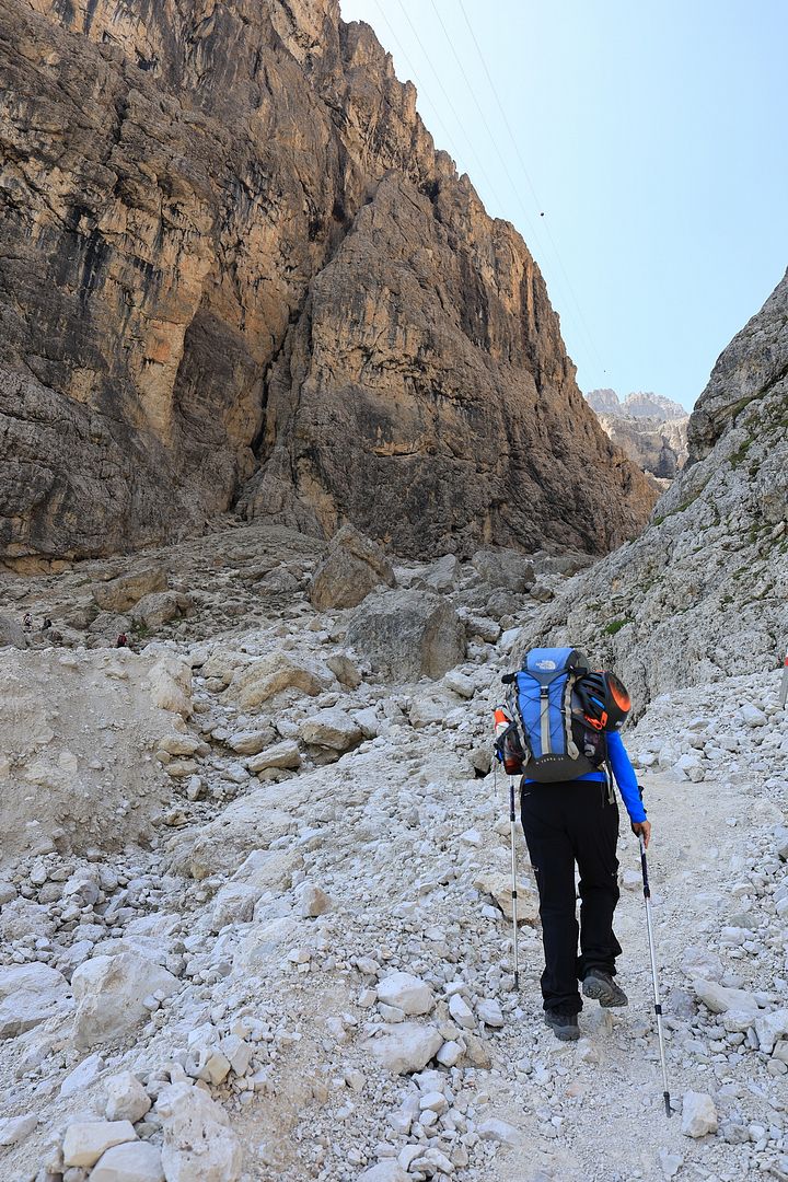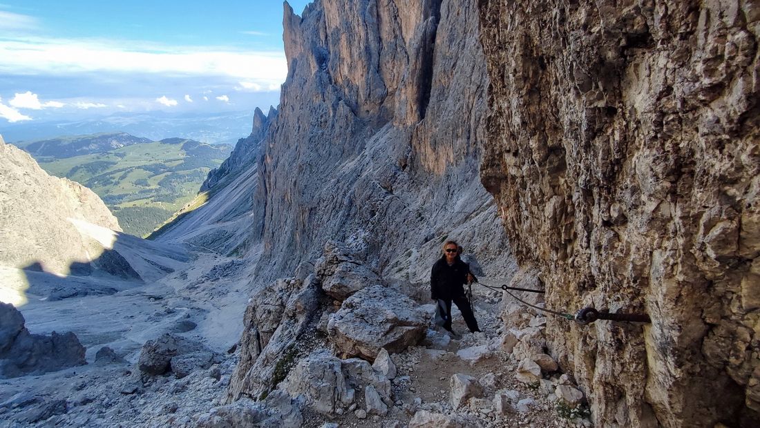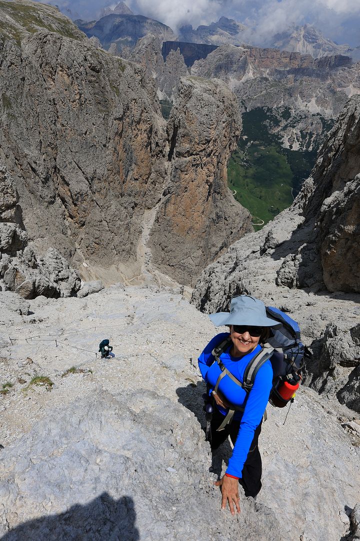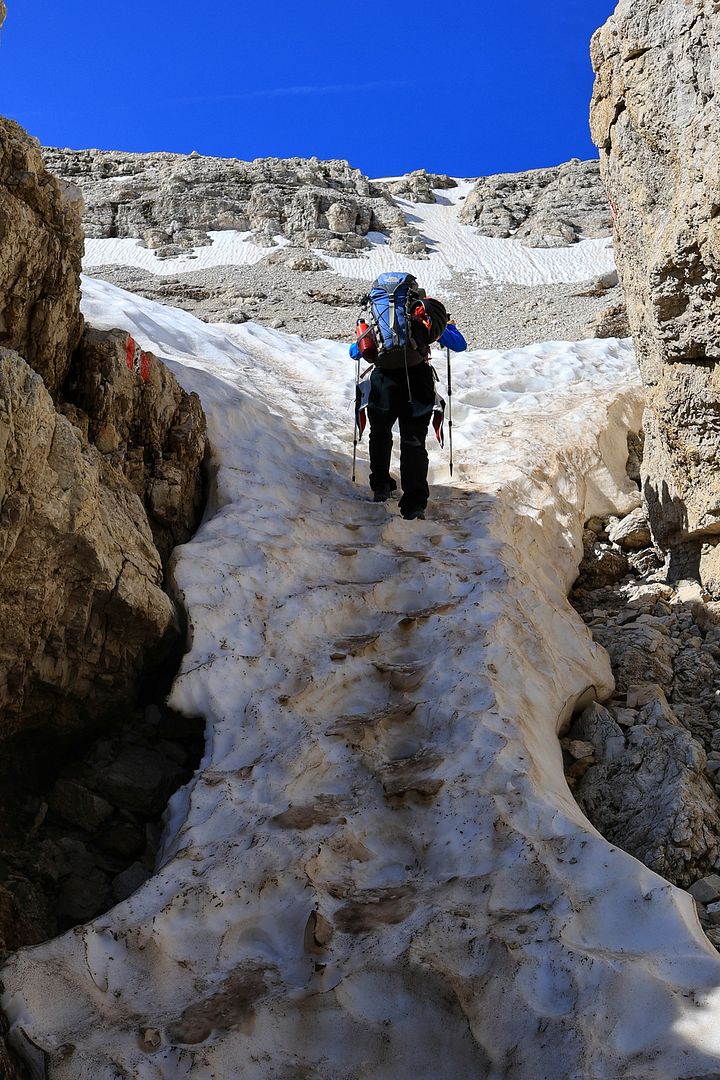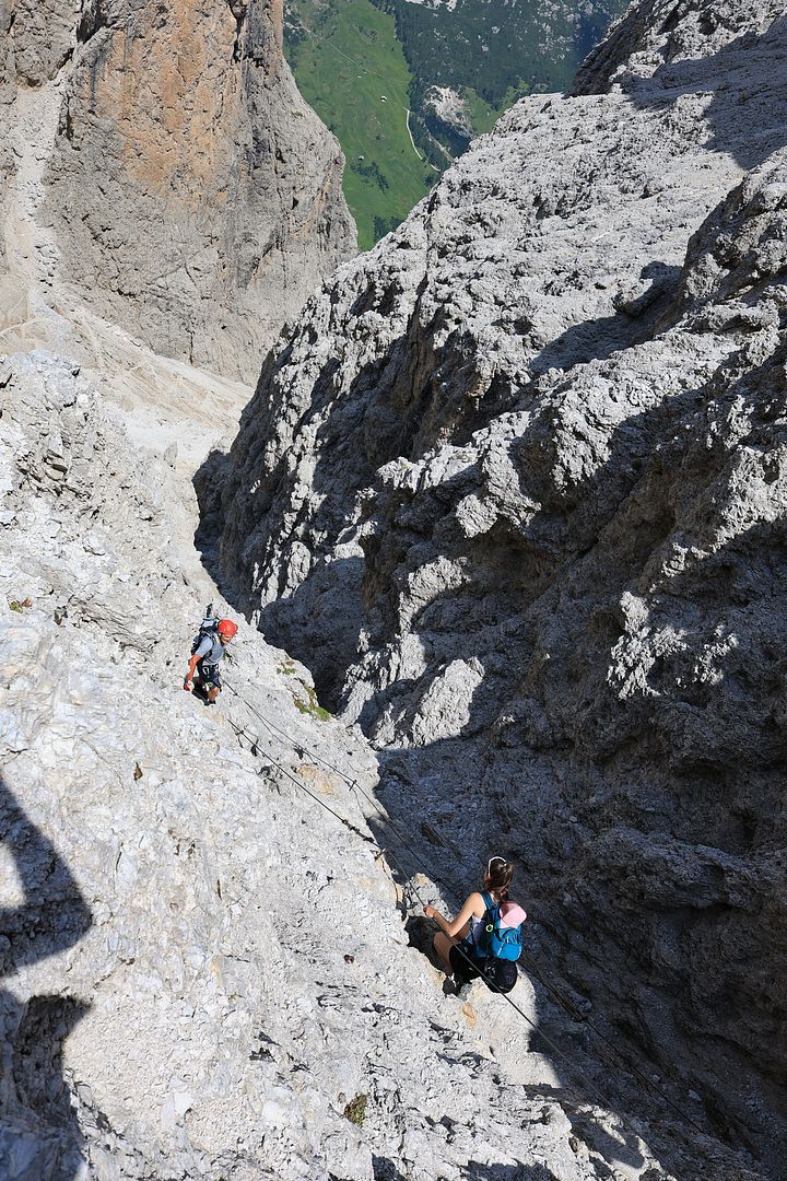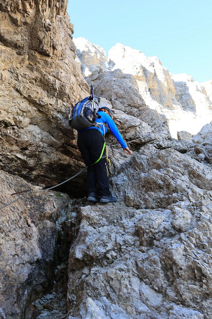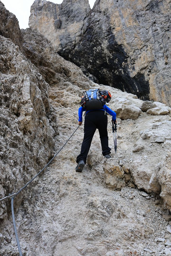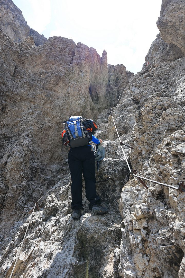 Una vez pasados la Selva y el Passo di Gardena donde paramos poco, emprendemos la subida al refugio, aquí hay una alternativa de subir por una impresionante vía ferrata o por la vía normal, que tiene poco de normal ya que es prácticamente otra vía ferrta con cables, clavos, trepaderos, neveros, etc. no llegamos en esta ocasión a ponernos el equipo de ferrata minimalista que llevábamos (arnés de fortuna de cinta + disipador + cordino + mosquetón + casco ultraligero) ni los crampones, pero es recomendable si no se tiene experiencia en trepar por roca. En otros pasos si que los usamos. Se salvan unos 500 m de desnivel muy verticales al final.