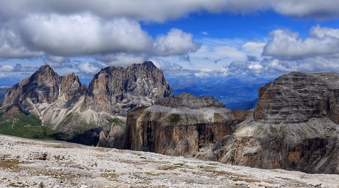 Al Sur, entre nubes, La Marmolada, para allá vamos, mas cerca a la izquierda el Piz Boè (3.152 m), a sus pies está el refugio Boè por el que pasaremos, a la derecha el Saas Pordoi con el popular teleférico que tomaremos.
