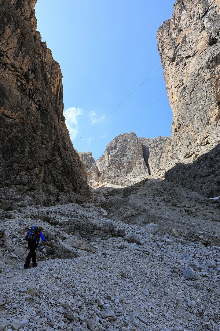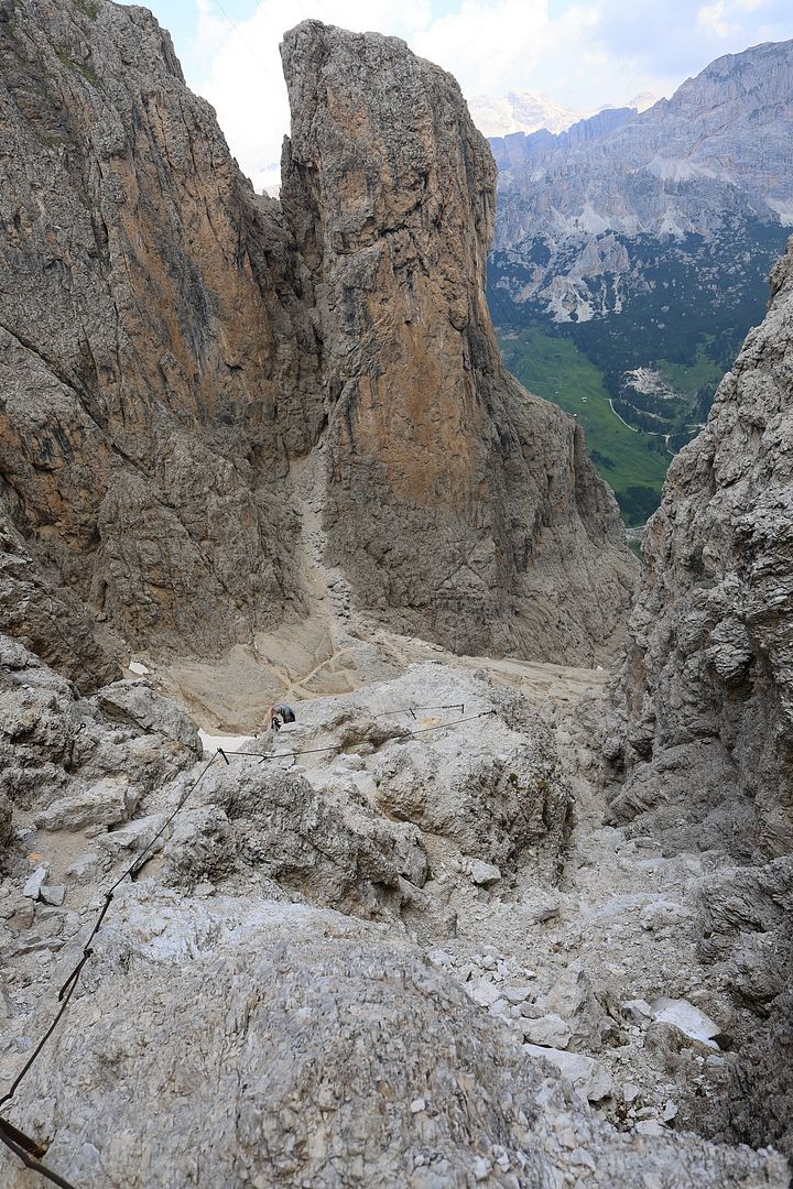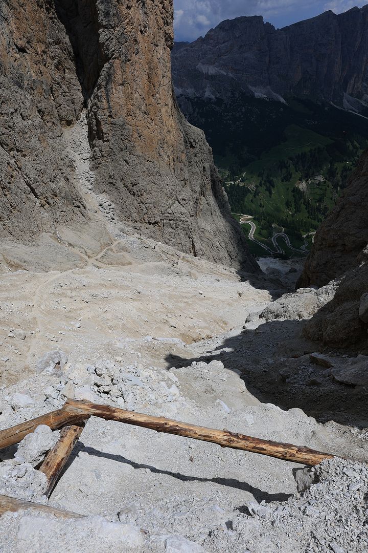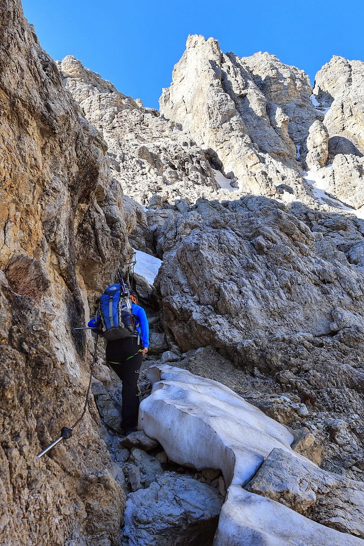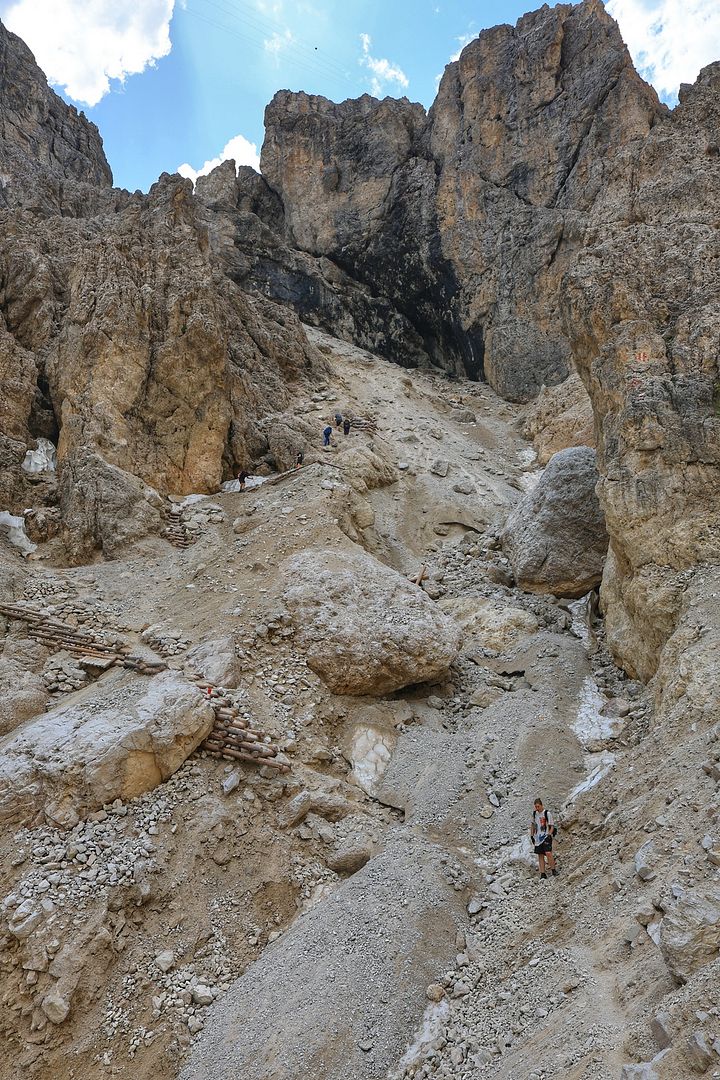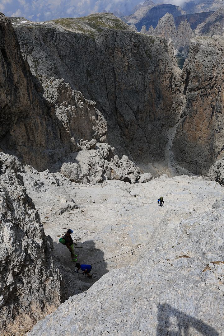 Dejamos el paso y comenzamos nuestra primera ascensión de importancia, la Forcella della Pùtia (Peitlerscharte), a 2357 metros subiendo un paredón de unos 500m. Las forcellas es como llaman por aquí a los pasos de montaña a pie, suelen aprovechar zonas de derrumbes para superar las imposibles paredes verticales, con zigzagueantes caminos de piedra suelta con frecuentes apoyos de cables tipo vía ferrata, clavos o pasos de madera.