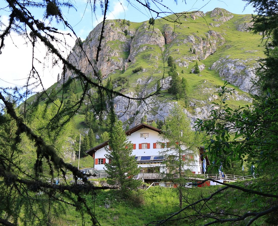 Abajo en el Val da la Tas-cia, el refugio Fusciade, donde se hace a veces etapa de AV2, aquí se une con la alternativa del Este de la Marmolada, nosotros lo usamos como avituallamiento de mediodía.