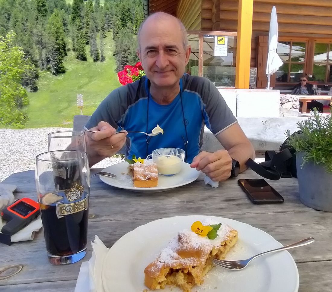 El Passo Rodella, refugio Halslhütte, primera parada para repostar y entrar en contacto con uno de nuestro compañeros de viaje, el "Apfelstrudel" un chute energético que degustamos en todas sus variedades. Toda esta zona muy alemana.