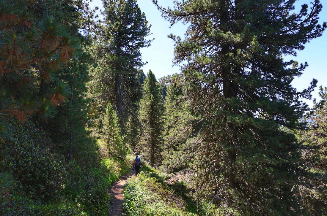 Bajando por un impresionante bosque de abetos hacia el Passo Rodella