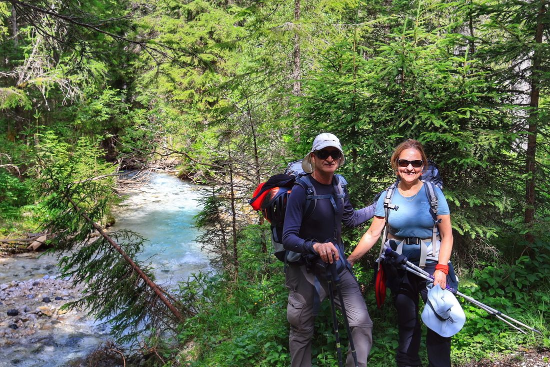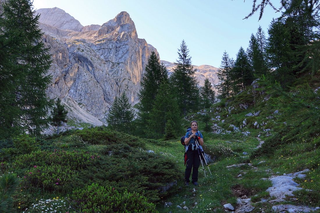 3ª Etapa, hoy toca madrugar habían anunciado tormentas a partir de las 12 am . Esta ruta alternativa tiene la ventaja de pasar por zonas boscosas y de pradera muy paisajísticas pero las desventaja de que baja bastante en el Val di Gardena hasta llegar al pueblo de la Selva di Val Gardena y luego hay que remontar mucho hasta retomar la AV2 clásica, afortunadamente desde la Selva parte un teleférico que salva unos 650 m gracias a lo cual pudimos suavizar el gran desnivel. La etapa va desde el refugio Firenze hasta el refugio Rifugio Franco Cavazza al Pisciadù, unos 13 kms y un desnivel de unos 1.800m de cuales 650m hicimos en teleférico.