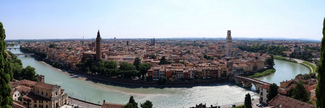 Vista panorámica de Verona desde el mirador Castel de San Pietro con el río Adige y Ponte Pietra en primer plano