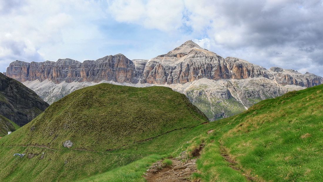 Nos acercamos al teleférico por un sendero superpanorámico, en la brecha se avista el refugio Pordoi.
