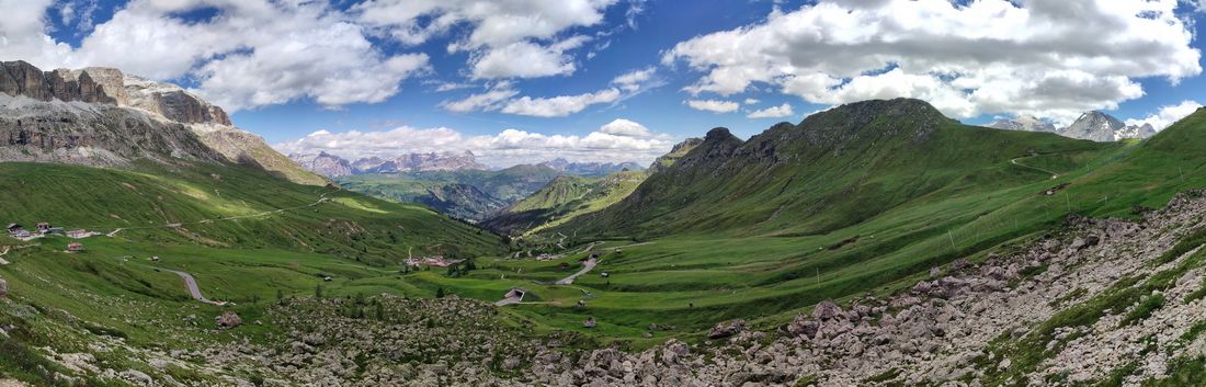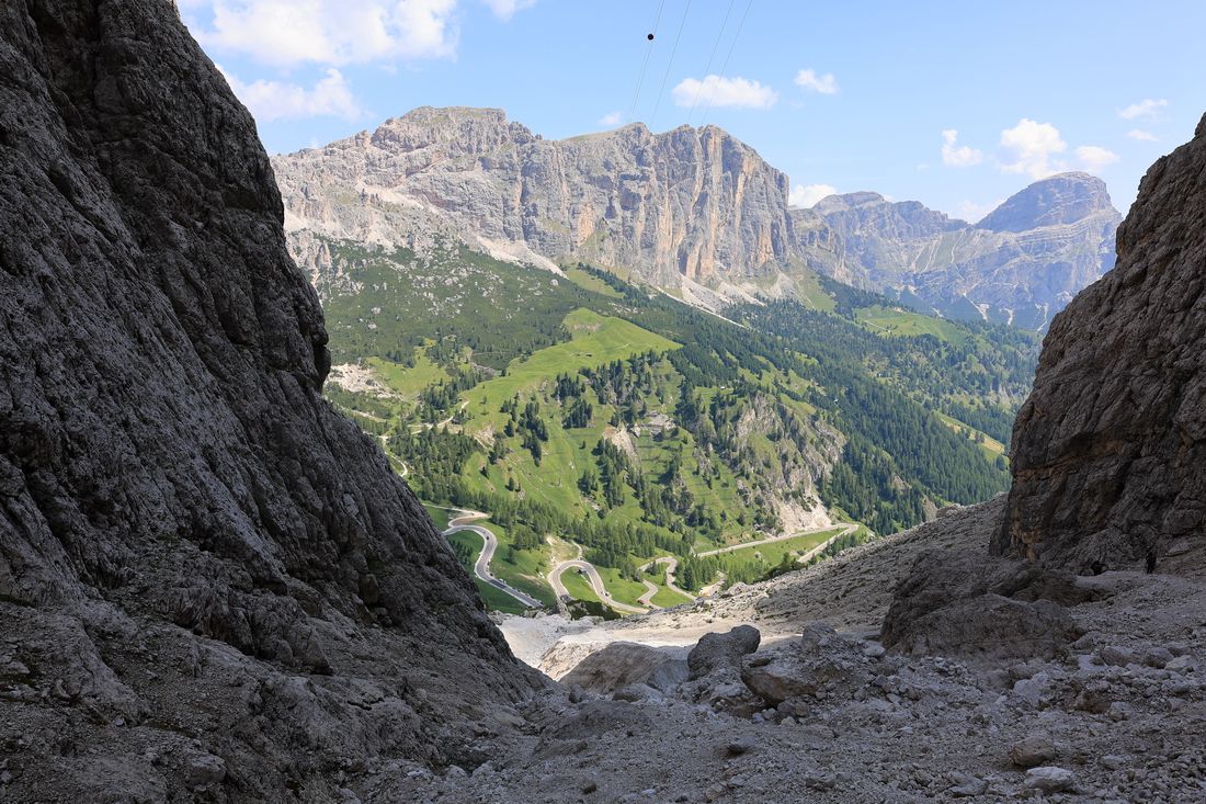 Vista de la subida Este del paso Pordoi del que vamos saliendo tras toma un rápido tentempié en territorio motero y ciclista.