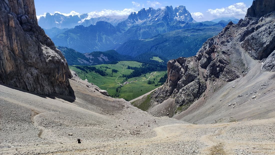 Vista atrás, abajo el refugio y al fondo el Sassolungo