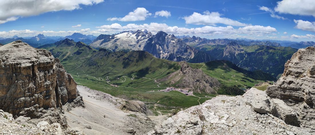 Vistas impresionantes del macizo de la marmolada desde la terraza del teleférico. Abajo el paso Pordoi, un hito de moteros y ciclistas. Para allá nos dirigimos.